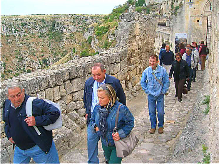 La visita dei trulli ha suscitato interesse e curiosità nei gitanti. Originariamente previste come abitazioni precarie, esse si sono evolute in realtà stabili e, in base alla loro grandezza, confortevoli. La giornata è trascorsa piacevolmente ed è finita con la cena in albergo. Domenica 9, trasferimento in Basilicata, nella rinomata città dei sassi: Matera. I Sassi di Matera sono un insediamento urbano derivante dalle varie forme di civilizzazione del genere umano attraverso i secoli. Anche qui l’interesse per il luogo caratteristico è stato decisamente notevole. In serata il ritorno in paese.