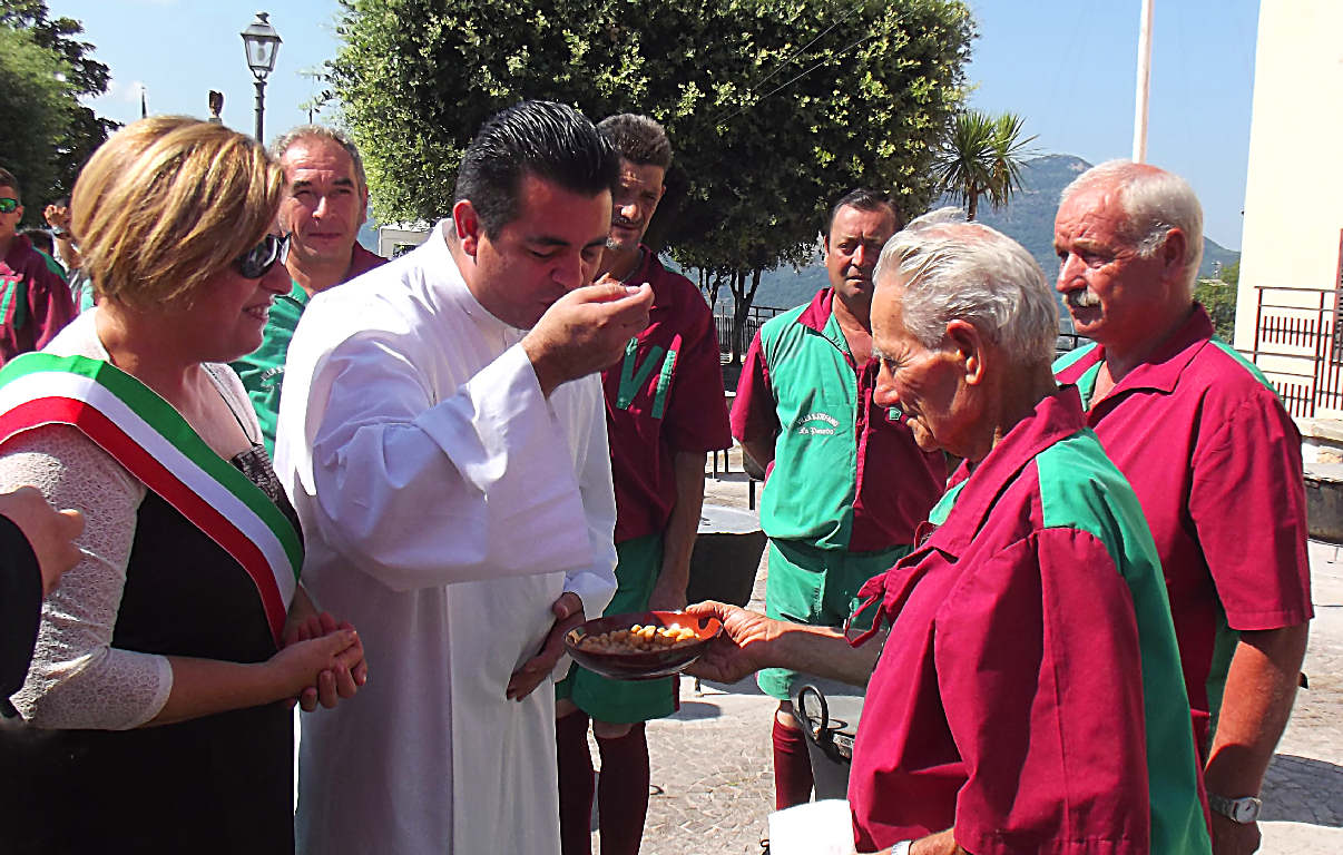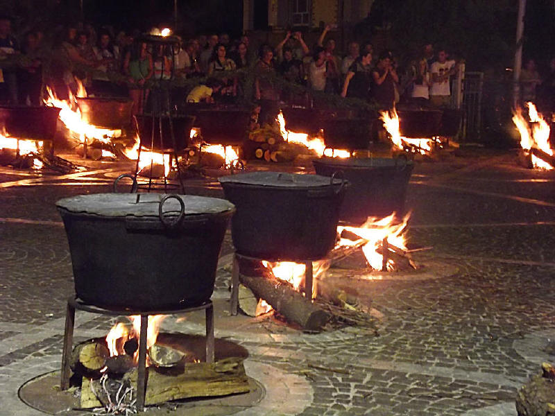 La lunga giornata dedicata a San Rocco è iniziata con l’accensione simbolica, da parte del "prencipe", delle "callare" (caldaie in rame stagnato) per la cottura dei ceci (la Panarda). Il principe era giunto con il suo corteo di cortigiani e popolani in costumi dei primi del XVII secolo, periodo in cui risale la prima "Panarda" documentata. Le "callare", sotto l’attenta cura dei "servitori" e dei "maestri di mensa", sono rimaste accese fino alla completa cottura dei ceci durata tutta la notte. Il servizio della Banda Musicale Comunale, per le vie del paese, ha inaugurato la mattinata. La stessa Banda ha scortato, poi, un corteo di reduci della seconda Guerra mondiale, presente Biagio Iorio, e cittadini che hanno deposto una corona di alloro nel Monumento dedicato ai Caduti di tutte le guerre. Durante la posa della corona il trombettista, Alessandro Iorio, ha eseguito il "Silenzio". Il vicesindaco, Franca Colonia, ha ricordato l’importanza dell’Attestato di "Pubblica Benemerenza" al merito civile, che il nostro paese ha ricevuto, in data 8 aprile 2013, dal Ministro degli Interni e consegnato dal Prefetto di Frosinone Eugenio Soldà il 6 giugno. Al termine, i Maestri di Mensa, za’ Alfredo Lucarini e Renato De Filippi, hanno offerto una scodella di ceci bollenti, appena tolti dalla caldaia, per "l’assaggio ufficiale delle autorità civili e religiose" che ne hanno decretato, unanimemente, la bontà e la perfetta cottura. Il corteo è poi ripartito alla volta della Chiesa S. Maria Assunta in Cielo per la S. Messa solenne concelebrata da Don Eriberto e Padre Paolo. Dopo la funzione religiosa la statua lignea di San Rocco è stata nuovamente "incollata" in processione per i vicoli del centro storico. Giunta in piazza Umberto I è stata impartita la benedizione dei ceci e del pane della "Panarda". Ritornata la processione nella chiesa parrocchiale è subito iniziata la distribuzione della "Panarda". La distribuzione dei ceci e del pane per i turisti e i residenti fuori il paese è stata effettuata nel Monumento ai Caduti mentre quella "classica", nelle case del paese, in Largo Mons. Amasio Bonomi. In serata si è esibito in piazza il cantautore Giuseppe Povia, molto apprezzato dai presenti. Al termine del concerto è stata effettuata l’estrazione dei biglietti vincenti della lotteria associata alla "Panarda". 19 ottobre 2013 - Enzo Iorio |