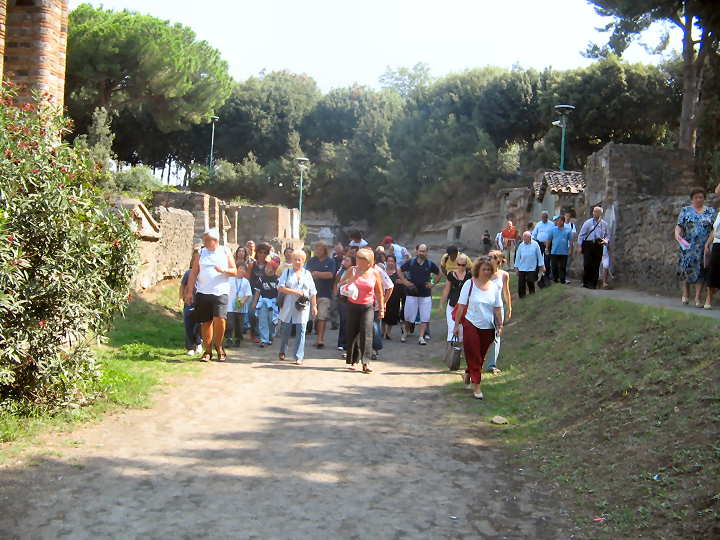 Siccome per i componenti del gruppo la vacanza …comincia in autostrada…, d’obbligo la sosta in autogrill per una ricca colazione. All’arrivo a Pompei i 55 "pellegrini" si sono momentaneamente separati, i più devoti si sono recati nella Basilica dove hanno assistito alla Santa Messa, gli altri hanno sostato nella piazza a godersi i primi panini ed un piacevole sole, seduti sui bordi della fontana. Alle ore 11, dopo aver degustato caffè, sfogliatelle e babà, tutti pronti a Porta Nocera da dove è iniziato il tuffo nel passato….a cura della sapiente guida "Ernesto" che è riuscito magicamente a far rivivere in pieno l’atmosfera di 2000 anni fa prima che……. nell’agosto del 79 d.c., la ricca cittadina, fiorente per il commercio della lana e del "garum" (una particolare salsa "orribile" ottenuta facendo imprutidire al sole interiora di pesce, molto gradita ai romani, con la quale condivano quasi tutti i cibi), venisse sepolta nella notte da cenere, lapilli e pietra pomice, in seguito alla eruzione del Vesuvio (in realtà dell’adiacente Vulcano Somma) dove persero la vita soffocati nel sonno o mentre fuggivano, circa 3000 abitanti. Grande stupore di bambini e adulti di fronte ai 13 calchi in gesso custoditi all’angolo di una vigna ripiantata con vitigni dell’epoca da una nota azienda vinicola , proprio nel sito dove si trovava. L’archeologo Giuseppe Fiorelli infatti, fece colare del gesso nelle cavità formatesi dopo la dissoluzione delle sostanze organiche appartenenti ai corpi realizzando così una fedele copia delle persone nei vari atteggiamenti in cui si trovavano al momento della morte, per lo più con le braccia alzate in segno di riparo dai gas e dalle polveri che li soffocavano. Quindi è stata ammirata "la palestra grande" nella quale i giovani pompeiani si allenavano nelle varie discipline: lotta, lancio del disco e del giavellotto… per prepararsi fisicamente alla vita militare. Ancora visibili, nelle colonne i fori dove appendevano le tuniche e le basi dei platani che circondavano il piazzale al centro del quale si trovava la piscina che al momento dell’eruzione non era più funzionante perché lesionata dal disastroso terremoto del 62 d.c.. La visita è proseguita verso l’"Anfiteatro" dove al centro dell’Arena la nostra guida ha fatto rivivere i combattimenti fra gladiatori, le "venationes" (lotta fra uomini e animali) e soprattutto la cruenta rissa che si scatenò sugli spalti tra tifosi nocerini e pompeiani che portò alla squalifica dell’anfiteatro da parte dell’Imperatore Nerone che ne vietò l’uso per 10 anni! E quindi "Gente di Villa" in "Via dell’Abbondanza", il decumano dell’antica città, ricca di botteghe, thermopolia (antenati dei nostri snack-bar), le couponae (osterie), le folloniche (per la lavorazione della lana), le lavanderie e le "Domus" dei cittadini più importanti come quella di "PAQUIO PROCULO" la cui immagine*, insieme a quella della moglie è giunta fino a noi ed ora si trova insieme a molte altre opere, nel Museo archeologico di Napoli (una delle nostre prossime mete!).