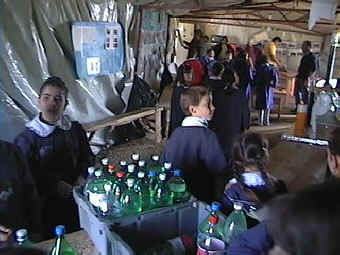 Sulle pareti del tendone c’erano appese molte foto ed articoli di giornali, una piccola televisione, una poltrona di plastica con una zampa di legno, un orologio. Poi alcuni tavoli, dei fornelli, lunghi sgabelli fatti con tavole di legno.